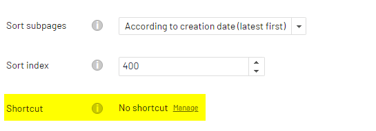 Click “Manage” and select “Shortcut to another content item” if your asset is stored in your Media Assets. If your page/document is on an external repository, you can also use “Shortcut to page on another website” and set an External Link.
