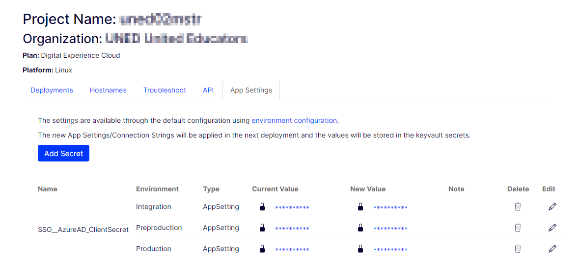 That was the interesting part of this configuration update. The visible code change was tiny: the committed value for SSO:AzureAD_ClientSecret was removed from appsettings.json and appsettings.Production.json, leaving the key present but empty. The actual secret was then expected to come from PaaSPortal-managed application settings at deployment time.